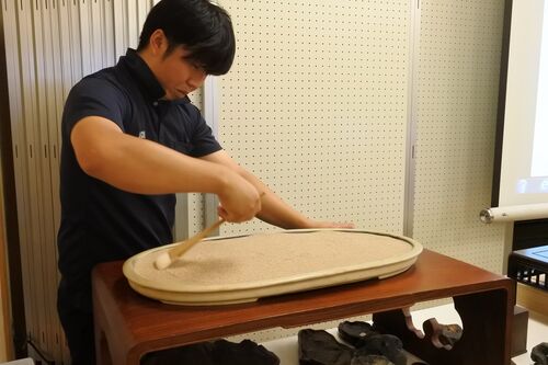 さて、水石の歴史を学んだあとは、実物を使ってデモンストレーションいただくお楽しみの鑑賞です。なかなかライブでは見ることがない、水石の展示方法や鑑賞方法をご紹介いただきました。 【精神統一の作業】 教室前方でアシスタントの方が、水石を飾る鉢を…